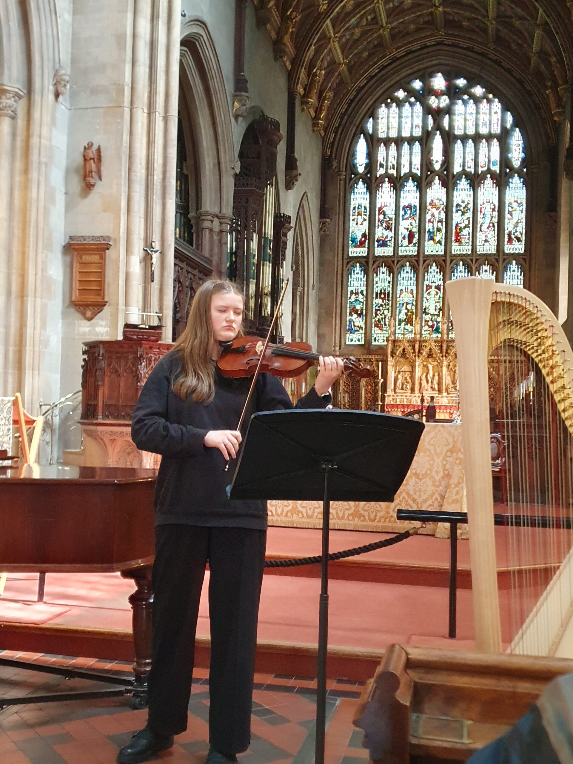The concert opened with Lara, who delivered a wonderful rendition of Kreisler’s Schön Rosmarin on violin. Her strong tone and articulate playing brought out the romantic melody beautifully. Following this, Alice captivated the young audience in particular, with Tournier’s 4th Sonata on the harp, showcasing her exquisite technique. Olanna then took to the piano, delighting us with a wonderfully contrasting interpretation of Mozart’s Allegro from his Sonata in F. Charlie followed with a graceful performance of Beethoven’s Romance No. 2, perfectly capturing its lilting rhythms and romantic content.